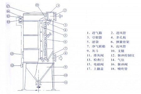 當(dāng)含塵氣體由上箱體進(jìn)入除塵器后,由上而下流動(dòng),經(jīng)布袋過(guò)濾以后,粉塵被滯留在袋外,凈化后的空氣則由布袋下口的凈氣聯(lián)箱匯集后,從出風(fēng)口排出。當(dāng)布袋表面負(fù)荷的粉塵增加,達(dá)到一定阻力時(shí),由控制儀發(fā)出指令,按順序觸發(fā)和電磁閥,開(kāi)啟脈沖閥,使氣包內(nèi)的壓縮空氣從噴吹管各噴孔中以接近音速的速度噴出一次氣流,從而誘導(dǎo)幾倍于該氣流的二次氣流一起噴入濾袋,造成濾袋瞬間急劇膨脹,從而使附著在濾袋上的粉塵脫離布袋,通過(guò)凈氣聯(lián)箱之間的間隙落入灰斗然后由排灰閥排出。