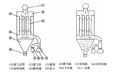 除塵器運(yùn)行一段時(shí)間后,濾袋內(nèi)表面捕集的粉塵層增厚,除塵器的運(yùn)行阻力上升,當(dāng)增加至一定值后,這就需要對(duì)濾袋進(jìn)行清灰,即通過外力將濾袋內(nèi)表面上附著的粉塵清除掉,使除塵器的運(yùn)行阻力下降,阻力下降到一定值后,該室濾袋又投入正常運(yùn)行。